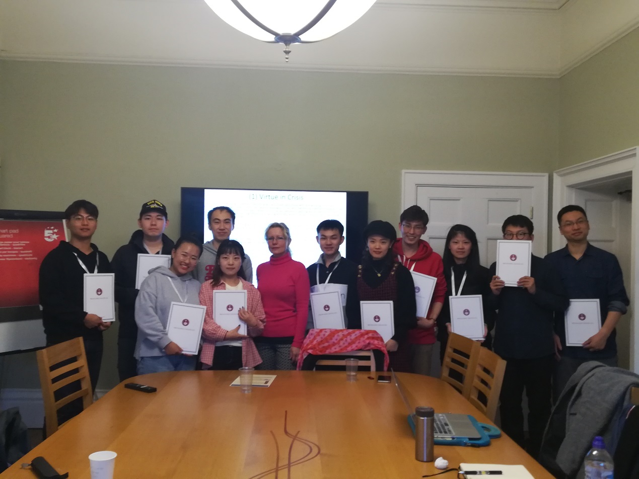 Unconsciously, the program in Britain was near to the end. On the last day, the whole team went back to Oxford to take the last courses. Dr. Mackenzie Graham described Aristotle's Virtue Ethics with the topic "Arete, Phronesis, and Eudaimonia: A Survey of Arisotelian Virtue Ethics." Since the topic was closely related to some students' research direction, the atmosphere within the classroom was very active. Then, Dr. Roxana Baiasu discussed the topic of "Feminist Discussions of Moral Justification and Autonomy" with students so as to talk about some issues about feminism. Feminism has acquired more and more attention in today's society, therefore, in the classroom all the students also launched a heated discussion. Finally, Dr. Anna Whiston began the conversation with the question, "To What Extent Is the Concept of Virtue Still Important in Today's World?" During the conversation, all the members discussed the important role of virtue ethics in the current society, and Dr. Anna Whiston put forward a hypothesis of moral fortification. She pointed out that moral fortifier can enhance people's ability of empathy and make people have a stronger desire to do virtuous things. Students all showed great interest in it and actively discussed it with Dr. Anna Whiston. At the end of the course, Dr. Anna Whiston gave the students their certificate of study. So far, "Jilin University Students' International Competitiveness Outstanding Program" - " Oxford University—Jilin University Short-term Philosophical Course Program " came to an end successfully.