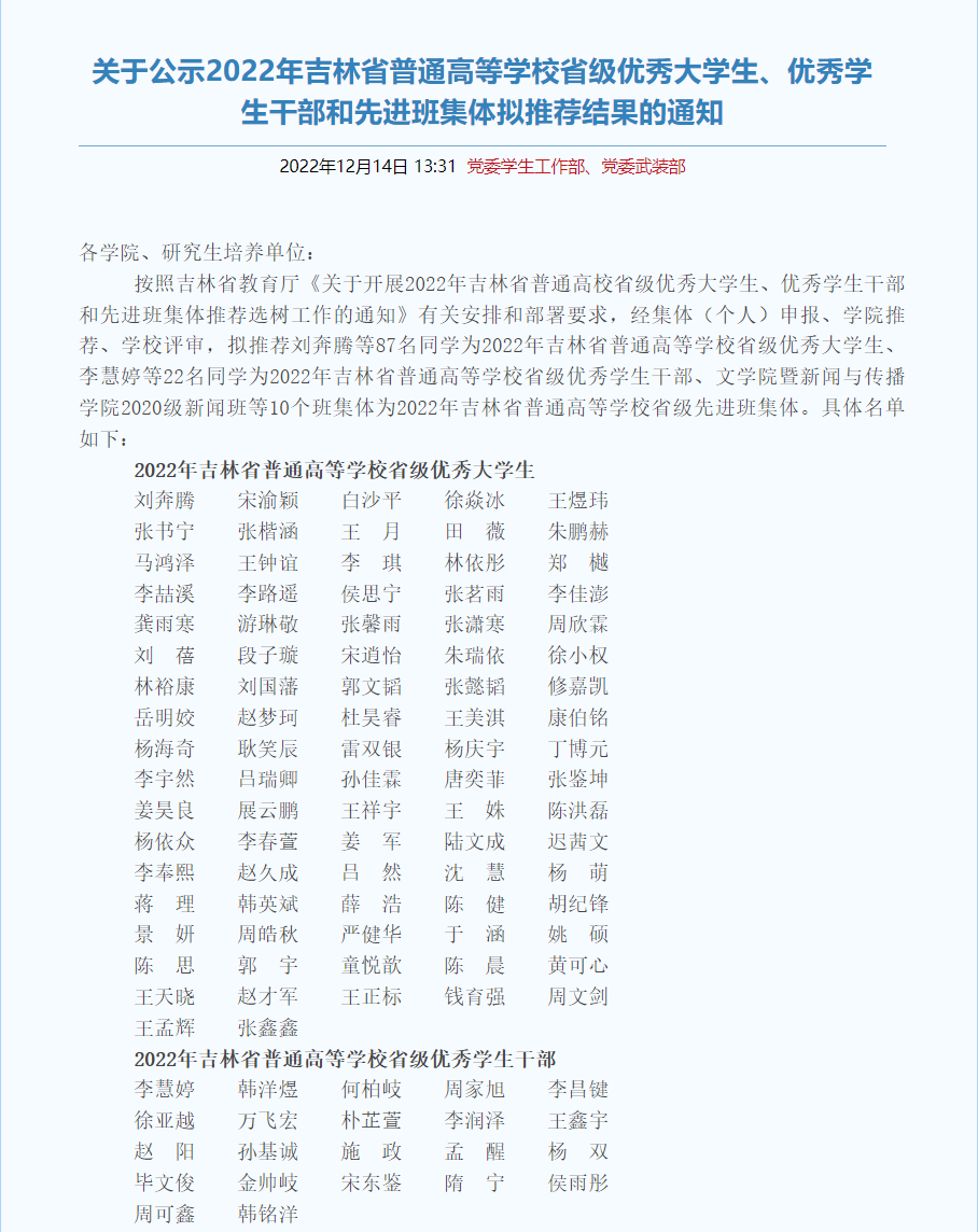 近日,根据吉林省教育厅《关于开展2022年吉林省普通高校省级优秀大学生、优秀学生干部和先进班集体推荐选树工作的通知》有关安排和部署要求,经集体(个人)申报、极速飞艇 推荐、极速飞艇 评审,极速飞艇 2019级社会学专业本科生刘奔腾同学、2020级马克思主义哲学专业博士生姜昊良同学荣获2022年吉林省普通高等极速飞艇 省级优秀大学生荣誉称号;2020级劳动与社会保障专业本科生李慧婷同学荣获2022年吉林省普通高等极速飞艇 省级优秀学生干部荣誉称号。