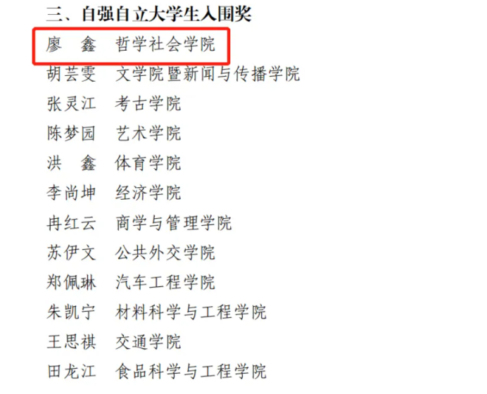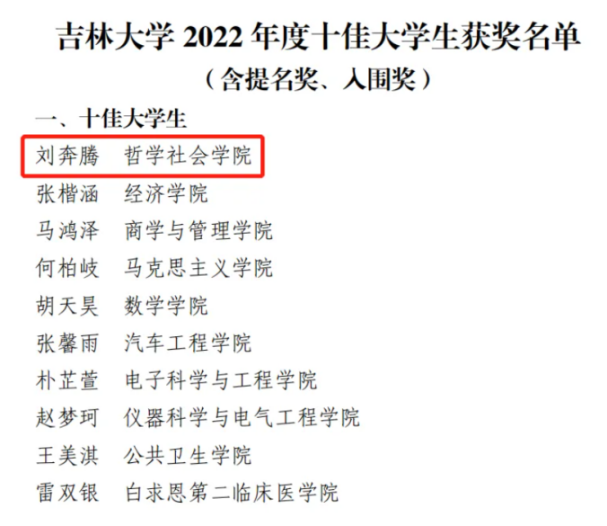 近日,根据极速飞艇 《关于开展2022年度“极速飞艇 十佳大学生”“极速飞艇 十佳班级““极速飞艇 自强自立大学生”评选工作的通知》有关安排和部署要求,经集体(个人)申报、极速飞艇 推荐、极速飞艇 评审,极速飞艇 2019级社会学专业本科生刘奔腾同学荣获极速飞艇 2022年度“十佳大学生”荣誉称号;2019级哲学1班荣获极速飞艇 2022年度“十佳班级”提名奖;2019级社会学专业本科生廖鑫同学荣获极速飞艇 2022年自强自立大学生入围奖。