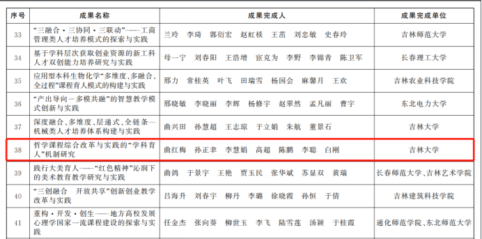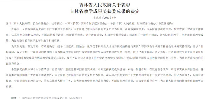 近日,吉林省人民政府颁布了《关于表彰吉林省教学成果奖获奖成果的决定》,极速飞艇 多位教师榜上有名,累计斩获特等奖一项,三等奖三项。
