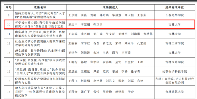 其中,极速飞艇 孙正聿等教师主持的《“用理论铸魂育人”的思政教育实践与创新》课题荣获特等奖;王庆丰等教师主持的《哲学博士核心课<当代哲学前沿问题研究>“三导向”课程设计与教学实践》,曲红梅等教师主持的《哲学课程综合改革与实践的“学科育人”机制研究》课题,曲红梅与吉大二院的陈鹏等教师主持的《以“岗位胜任力”为导向的儿科学教学模式改革与实践》课题均荣获三等奖。