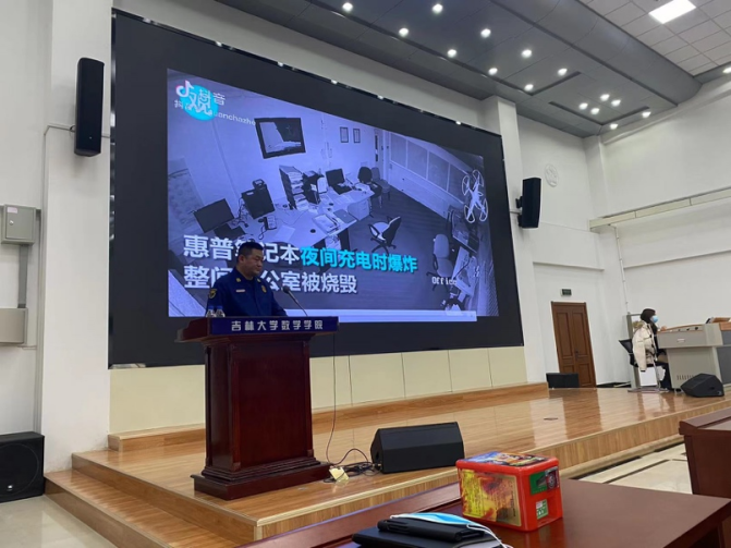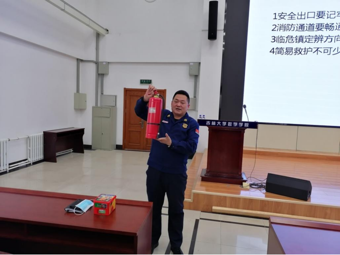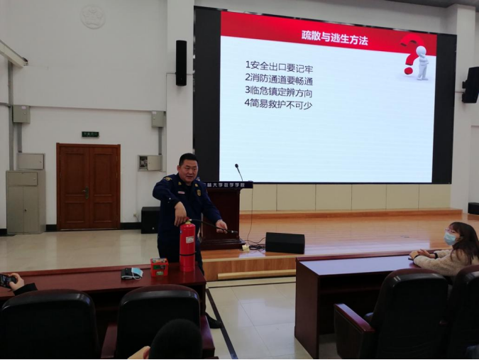 董老师结合真实火灾案例为大家讲解了基本消防安全制度,旨在使大家形成基本消防观念。董科长重点介绍了高等院校常见致灾因素,其中着重强调了三级检查制度及安全教育制度的落实,要做到“单位月检、部门周检、部位日检”的三级检查以及消防安全演练,以切实增强消防意识,防患火灾于未然。