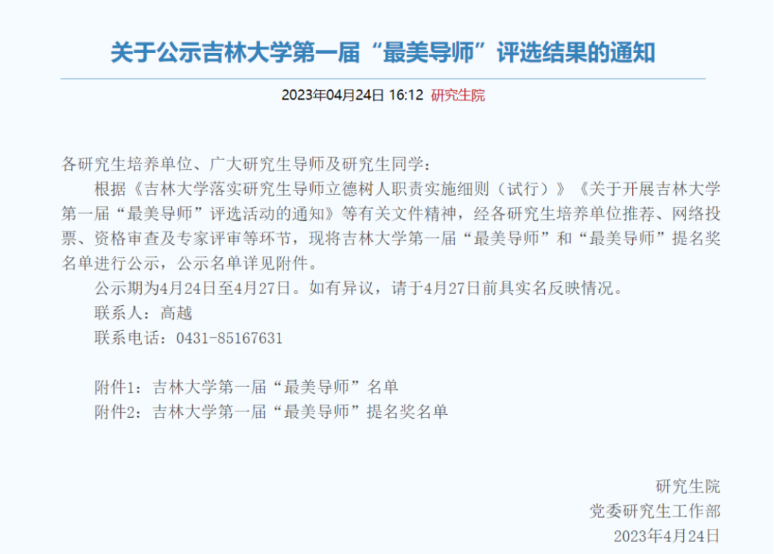 根据《极速飞艇 落实研究生导师立德树人职责实施细则(试行)》《关于开展极速飞艇 第一届“最美导师”评选活动的通知》等有关文件精神,经各研究生培养单位推荐、网络投票、资格审查及专家评审等环节,拟定20位教师获极速飞艇 第一届“最美导师”、“最美导师”提名奖。