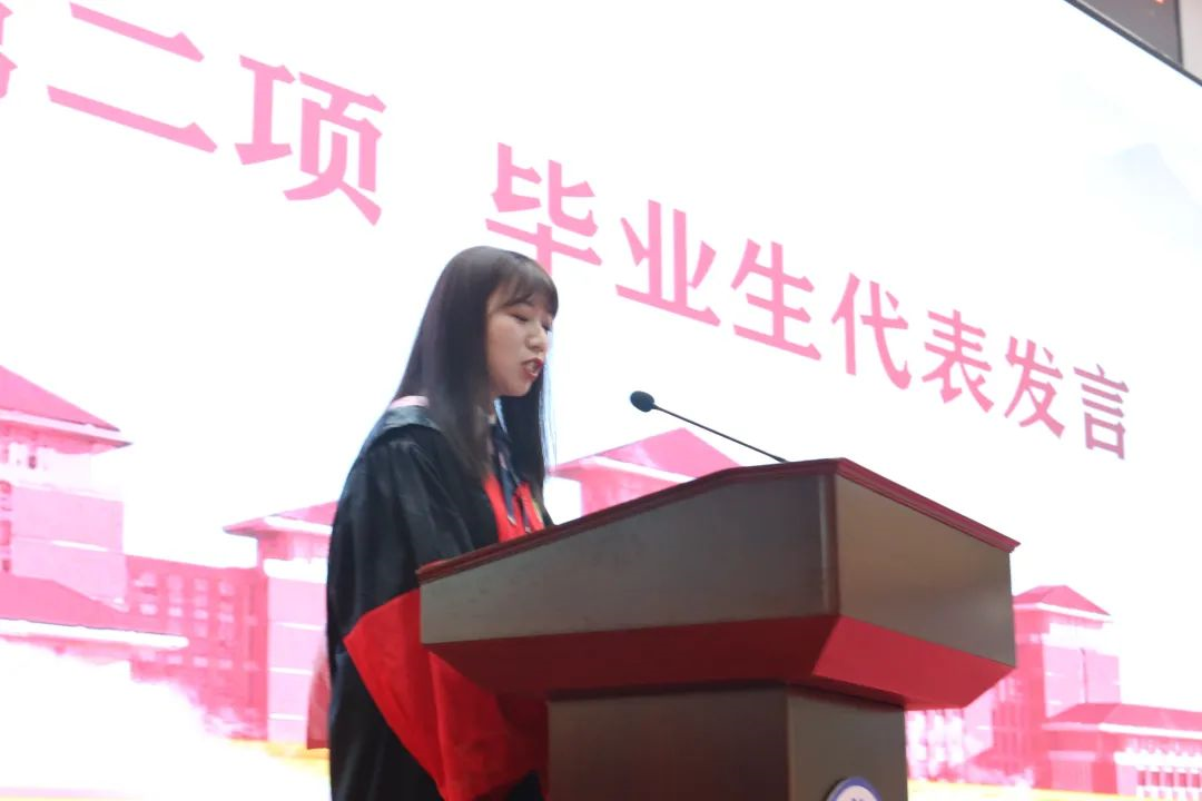 典礼第三项,由在校生代表2018级哲学专业本科生刘昕冉上台发言,为毕业的师兄师姐们送上诚挚的祝福和殷切的期盼。以毕业的师兄师姐们为榜样,激扬青春、不负韶华!希望师兄师姐们能在未来“乘长风破万里浪”,翩翩归来、仍是少年!