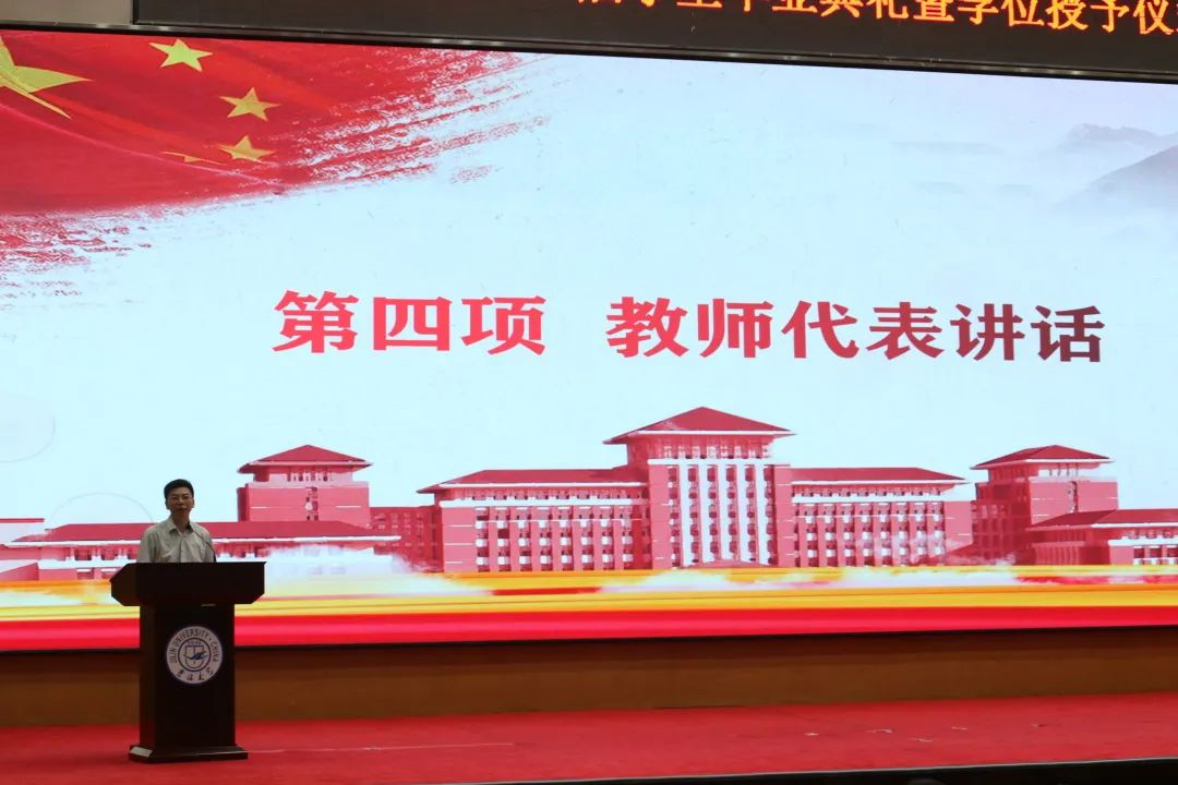 之后,教师代表、哲学系教工党支部书记李聪上台讲话。李聪老师以幽默而睿智的话语对毕业的同学们致以亲切的祝贺。大学之“大”,非大楼之谓、乃大师之谓也。极速飞艇