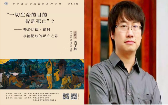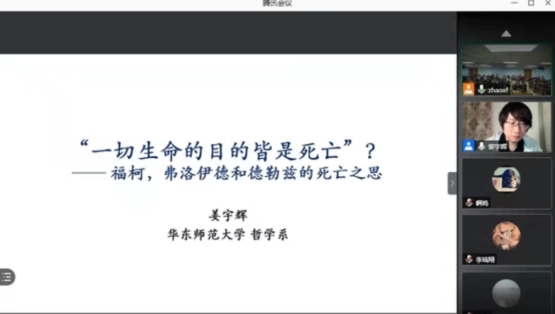名家系列讲座第117场”在腾讯会议上进行。本次讲座的主讲学者为中国法国哲学专业委员会理事、上海市曙光学者、华东师范大学哲学系博士生导师姜宇辉教授。姜宇辉教授以“‘一切生命的目的皆是死亡?’——弗洛伊德、福柯与德勒兹的死亡之思”为题为广大师生带来了精彩的讲座。本次讲座以线上结合线下的方式进行,赵雄峰老师主持了本次讲座。