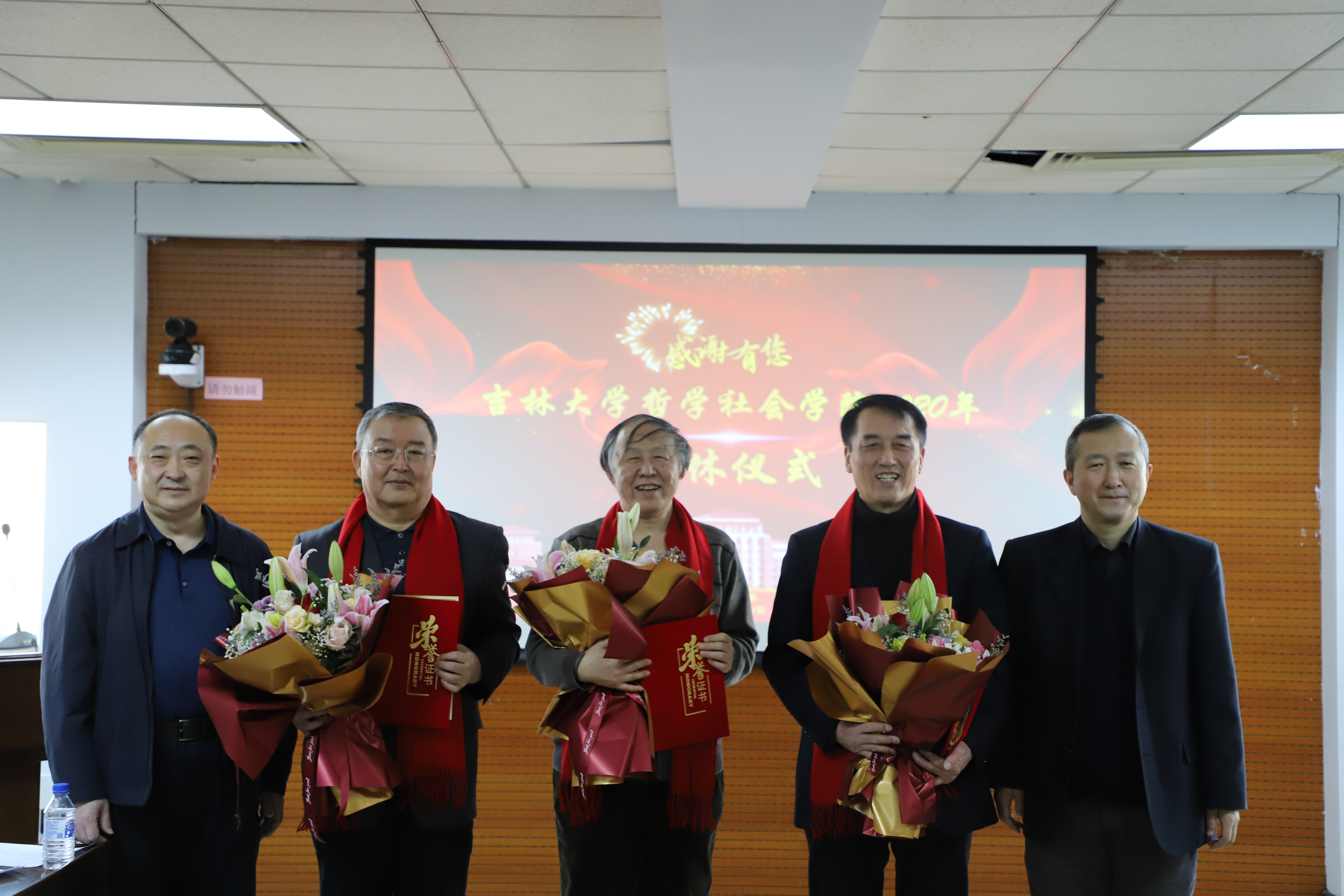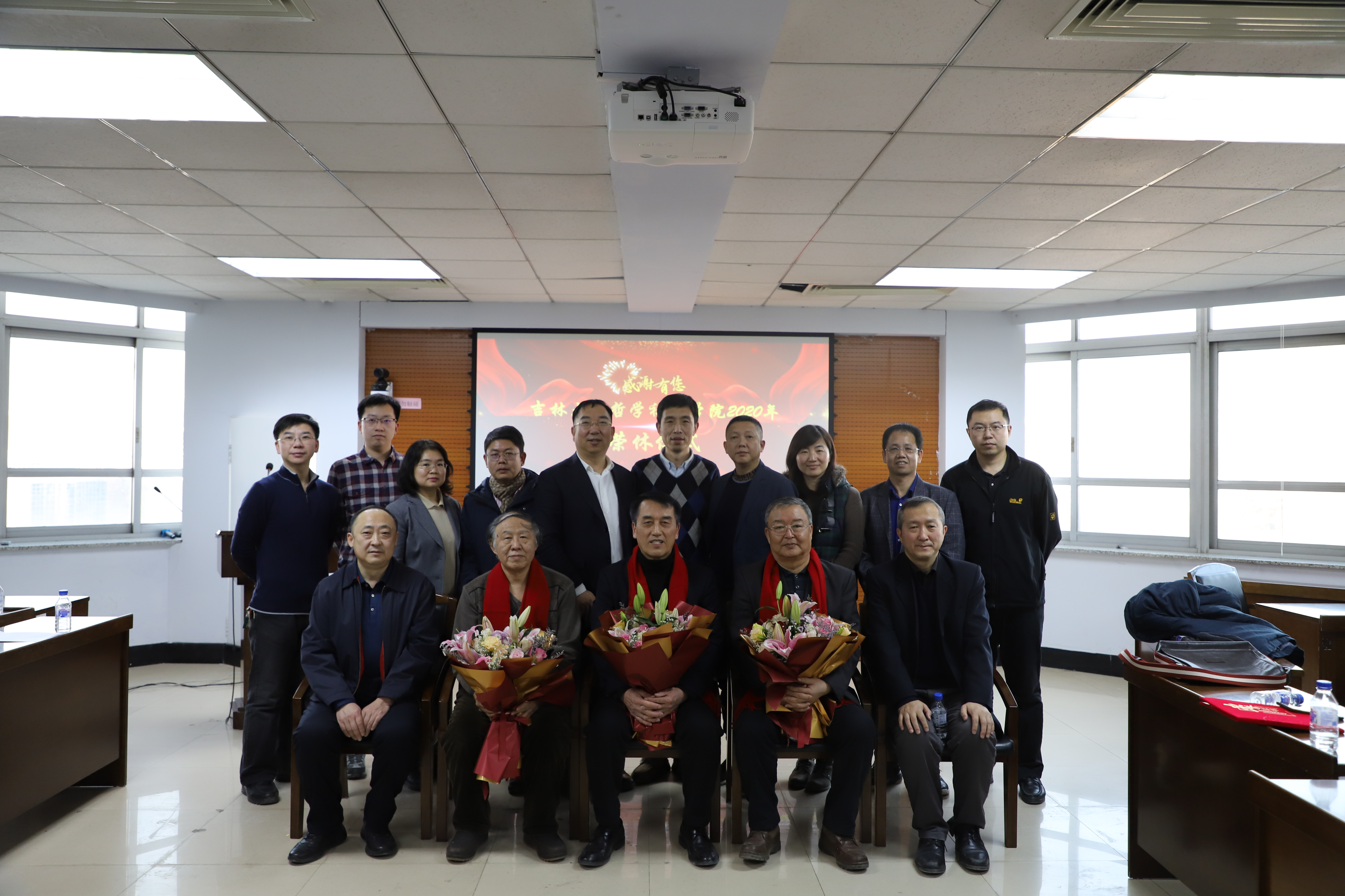 各项事业做出的贡献表示感谢。院长田毅鹏教授为王跃新、王天成、全华三位老师颁发荣休证书,年轻老师为三位老师献上鲜花。