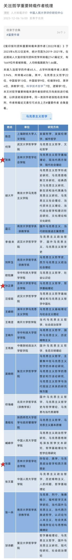 日前,根据中国人民大学发布的《复印报刊资料重要转载来源作者(2022年版)》统计,人大复印报刊资料哲学共转载2741篇论文,有1649位作者被转载,人均转载篇数为1.66篇。本版入选哲学的作者65人,占学科转载作者人数的3.94%,共转载453篇。
