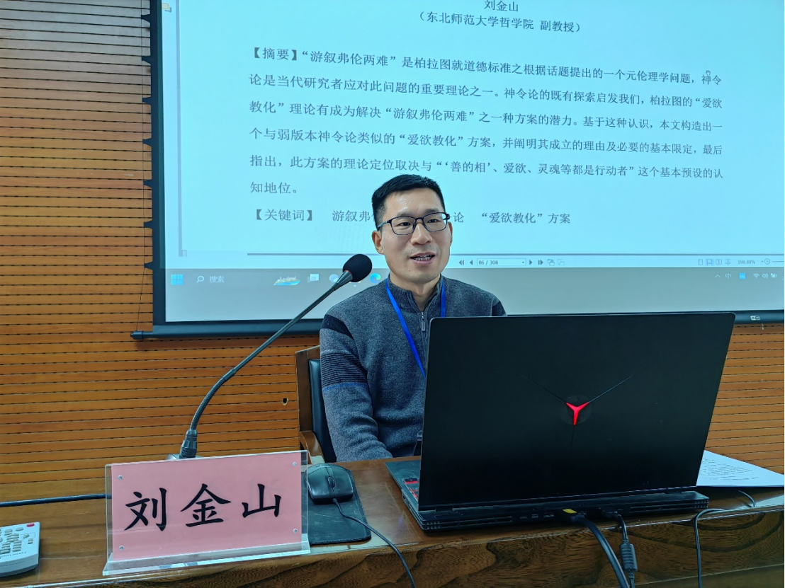 第一位发言人刘金山副教授的报告题目是《论应对“游叙弗伦两难”的“爱欲教化”方案》。刘老师指出,“游叙弗伦两难”是柏拉图就道德标准之根据话题提出的一个元伦理学问题,神令论是当代研究者应对此问题的重要理论之一。神令论的既有探索启发我们,柏拉图的“爱欲教化”理论有成为解决“游叙弗伦两难”之一种方案的潜力。