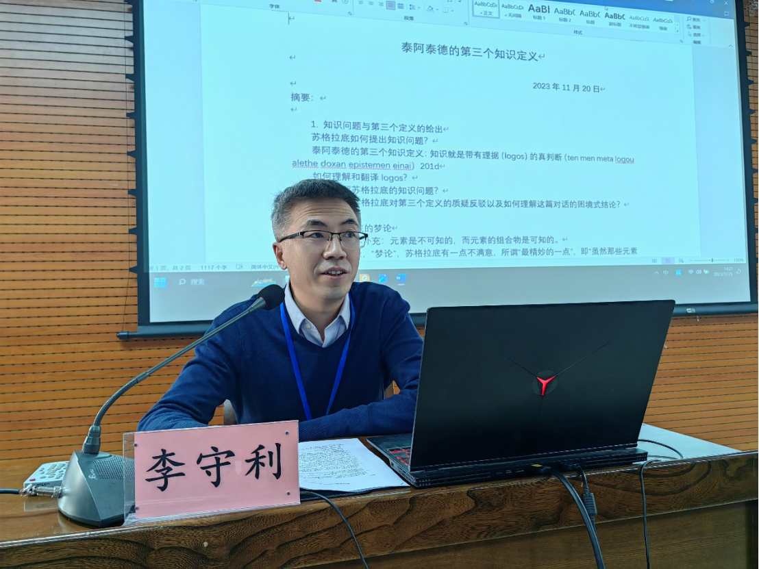 第二位发言人李守利副教授的报告题目是《泰阿泰德的第三个知识定义》。李老师指出,泰阿泰德的第三个知识定义是:知识就是带有理据(logos)的真判断(ten men meta logou alethe doxan epistemen einai)。第三个定义讨论中蕴含的辩证法方向:区分与综合的技术,既认识共性又认识差异,既认识整体又认识部分。