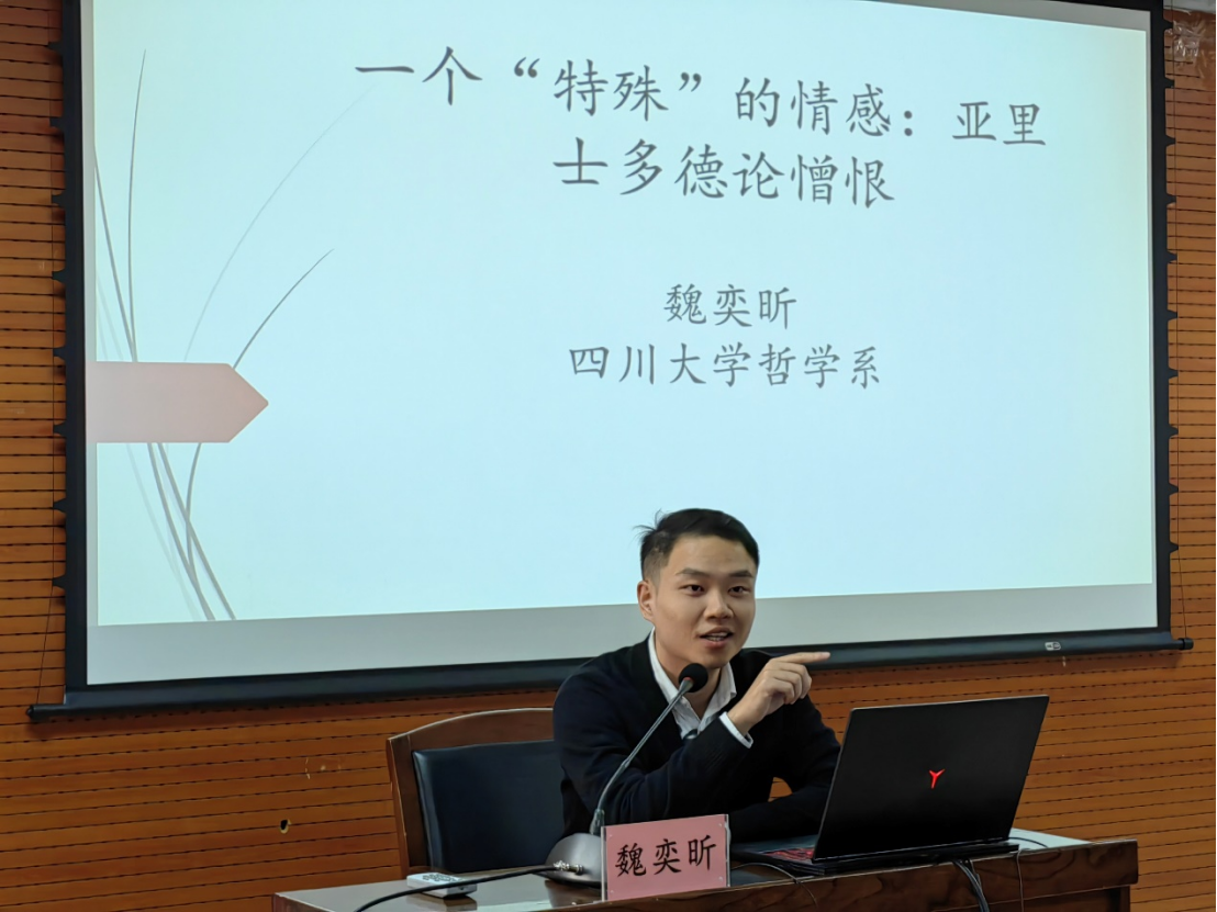 第三位发言人魏奕昕老师的报告题目是《诠释学感——作为当代一种最合适的哲学方式和生活态度》。魏老师指出,憎恨符合亚里士多德对情感的定义,因此它是一个情感。亚里士多德认为憎恨伴随着快乐:憎恨者希望自己憎恨的那类人遭祸、甚至彻底消失,这种想法能带来快乐。无论我们如何解读情感和快乐与痛苦之间的联系,憎恨的快乐都足够解释亚里士多德为什么把它看作一种情感。