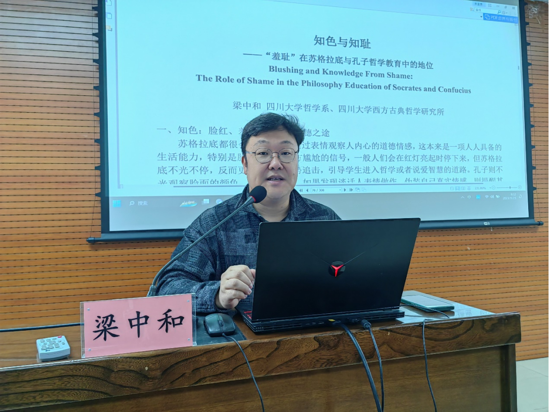 第一位发言人梁中和教授的报告题目是《知色与知耻:“羞耻”在苏格拉底与孔子哲学教育中的地位》。梁老师指出,苏格拉底与孔子都重视羞耻心在哲学教育中的地位,都将其当作道德教育的起点;他们的不同在于,苏格拉底更强调羞耻心带来的理智性的耻辱,求知是羞耻心激发的最重要方面,而孔子认为成德和践行才是羞耻心激发出的最重要方面。这个不同点源于两人的道德哲学基础不同。