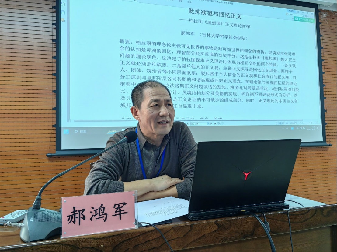 第一位发言人郝鸿军副教授的报告题目是《贬抑欲望与回忆正义——柏拉图〈理想国〉正义理论新探》。郝老师指出,柏拉图的理念论主张可见世界的事物是对可知世界的理念的模仿,灵魂观主张对理念的认知是灵魂的回忆,理智部分贬抑灵魂的欲望部分。这是柏拉图《理想国》探讨正义问题的理论底色。这决定了柏拉图探求正义理论时体现为相互交织的两个特征,一是实现正义就必须贬抑欲望,二是驳斥他人的正义观,主张正义探寻是回忆正义理念。