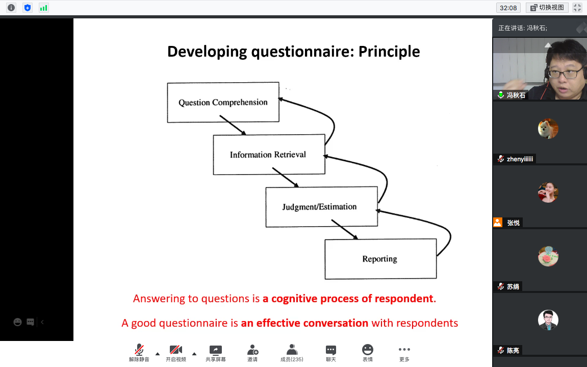 冯秋石老师首先以现代人“越长大越不快乐”的慨叹作为研究问题的切入点,对量化研究方法中的概念和操作化的意涵与手段进行讲授。他强调在真实的研究中研究次序可能会产生变化,操作化也不一定完全先于概念化。因此同学们在学习过程中不能僵化地掌握方法,应当将方法当作一本参考书,在迷茫困惑的时候回到方法的步骤进行反思和理解,机械地按图索骥往往难达所愿。在此基础上,定量分析进入数据收集与分析阶段时,由于大部分定量方法都是通过调查的方法收集数据,其中既要注重对样本群体的选择,也要重视对调查问卷的设计。同时,调查过程中问卷题序编排、受访者自选参照群体等因素都会对调查的准确性产生影响。冯老师认为定量研究之美就在于它可以将研究者的观察通过矩阵的方式展现,而调查数据的分析正是围绕二维表进行展开;而均值的美则在于它是基于无数次无规则“偶遇”所形成完美的正态分布,并在此基础上引导与会师生们形成对中心极限定理和假设检验逻辑的深入理解。