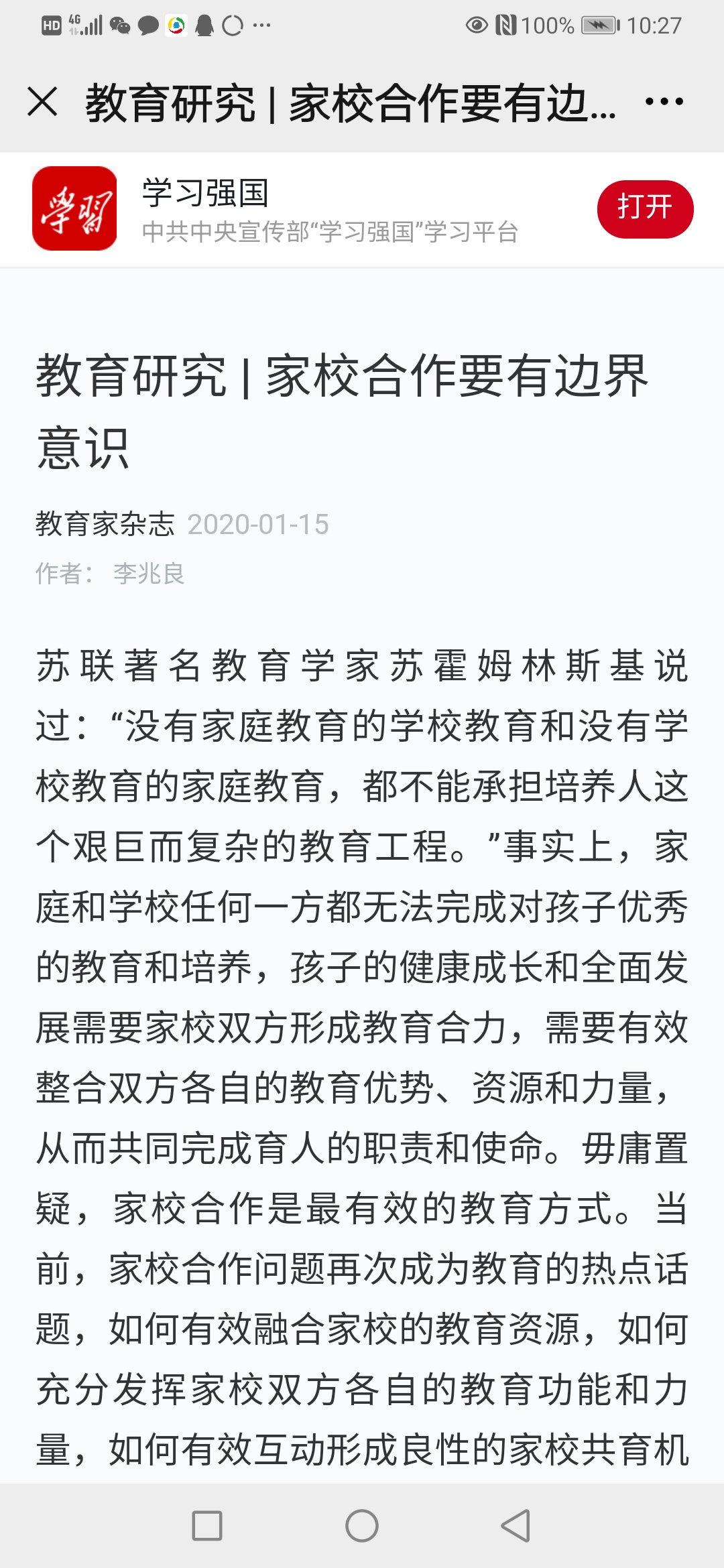 极速飞艇 李兆良教授于2019年4月发表在由《光明日报》主管的《教育家》杂志总第172期上的文章《家校合作要有边界意识》,被中共中央宣传部“学习强国”学习平台全文收录,作为全民与时代共进教育强国的学习内容。