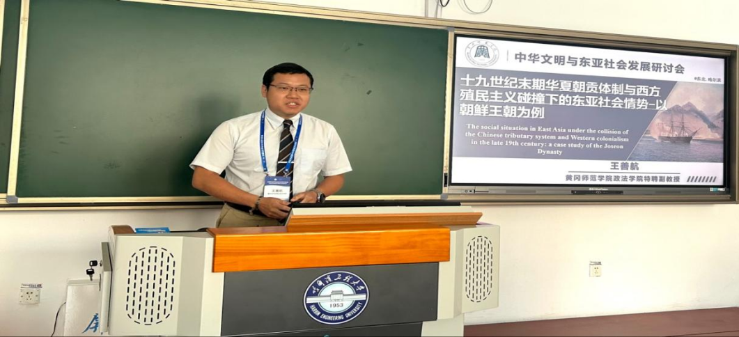 王善航副教授作了题为《十九世纪末期华夏朝贡体制与西方殖民主义碰撞下的东亚社会情势——以朝鲜王朝为例》的报告。他认为,19世纪,高宗时期的朝鲜王朝开始在清廷与日本的压力夹缝谋求国家自主发展之路,继而不断在既有礼制历法的朝贡体系及巧取豪夺与合约精神的殖民主义之间游移,进而采行对冲理论的外交策略。从社会角度来看,列强的进驻,不仅打开了朝贡体系封闭的循环,也激起东亚诸国开港开市,进行了各自的自强运动,东西文化的对撞交融也由此不断深化。