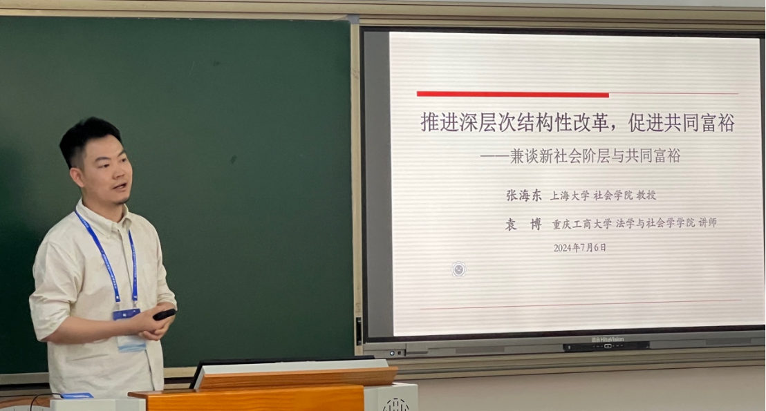 张海东教授、重庆工商大学社会学系讲师袁博作了题为《推进深层次结构性改革,促进共同富裕——兼谈新社会阶层与共同富裕》的报告。他们认为要实现共同富裕的远景目标,就必须在经济结构改革的基础上,同时推进社会层面的深层次结构性改革,破除结构性不平等因素,实现基本公共服务均等化,以增进人民福祉为首要目标。就新社会阶层而言,尽量消除各类社会结构壁垒,促进社会流动,提升与完善社会保障制度也是一个紧迫而且事关全局的大问题。