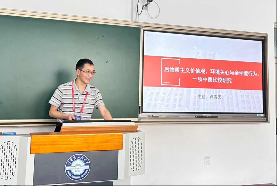 社会学系主任卢春天教授作了题为《亲环境行为及其影响机制——一项中德的比较研究》的报告。他从中德两国社会文化环境的差异出发介绍两国亲环境价值观念、态度与行为的差异,以及后物质主义价值观如何通过环境态度影响居民的亲环境行为。研究发现,中国居民倾向于更加温和、保守和私人性质的环保行为,环境态度的中介作用也更加强烈。