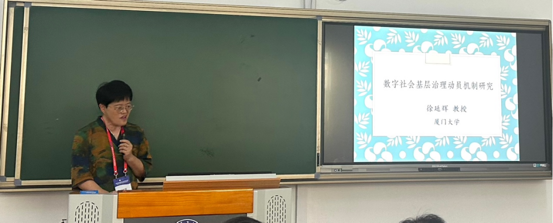 副院长徐延辉教授作了题为《数字社会基层治理的动员机制研究》的报告。她结合中国基层政府的制度情景和数字平台建设的实践场景,将TOE框架由三要素拓展为TOEI(技术—组织—环境—身份认同)四要素,认为基层社会治理活动存在技术动员、组织动员、制度环境动员和地域身份认同动员四种机制。