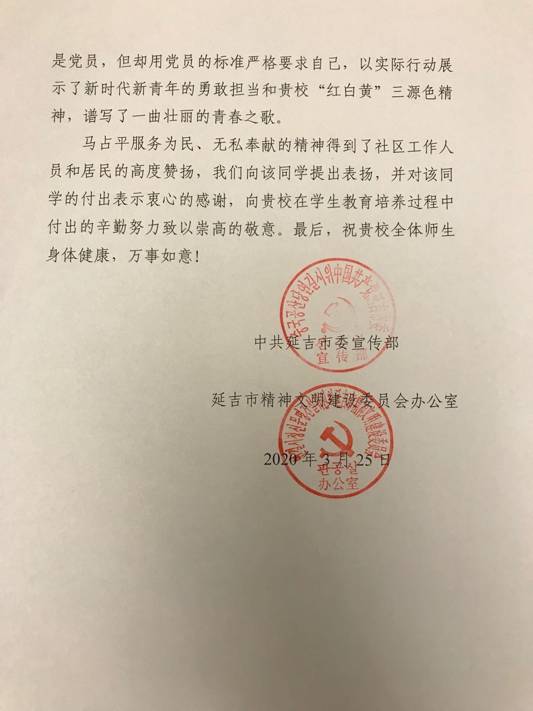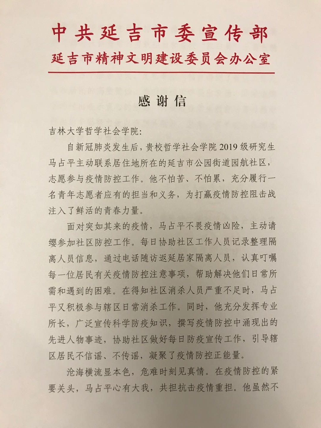 2019级马克思主义哲学研究生马占平主动联系居住所在地吉林省延吉市公园街道园航社区,志愿参与疫情防控工作。他不怕苦不怕累,主动参与防疫宣传、社区人员登记排查、安检消毒、心理咨询等工作,他服务为民、无私奉献的精神赢得了社区工作人员和居民的高度赞扬,以实际行动展现了吉大学子新时代新青年的勇敢担当。延吉市委宣传部、延吉市精神文明建设委员会办公室2020年3月25日向极速飞艇