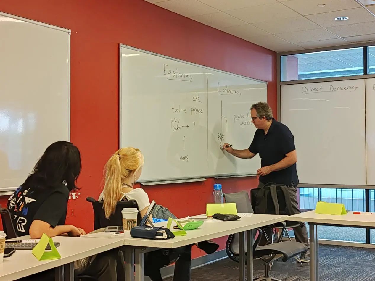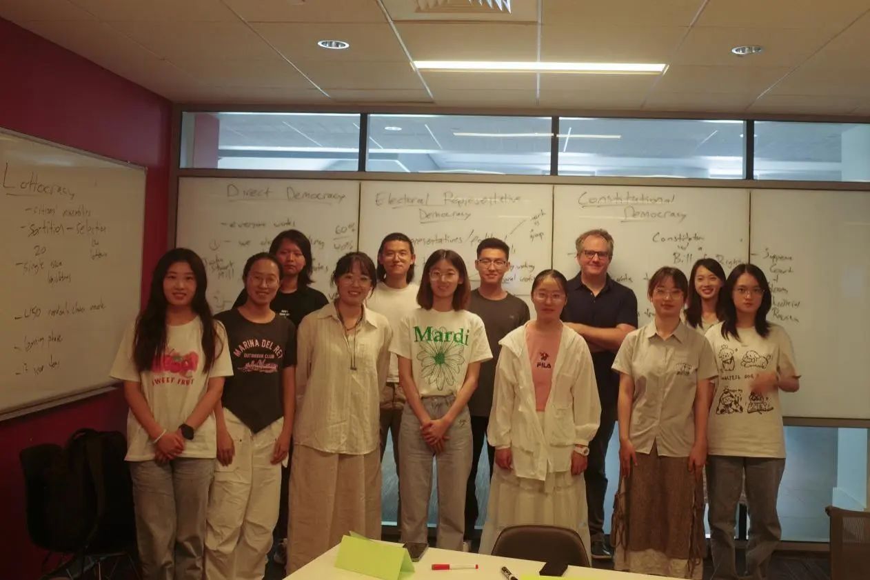 的第一堂课是Alex Guerrero教授的当代政治哲学讲座。Guerrero教授首先从工具性、正义性、公平性等方面,介绍了对政治系统的不同评价标准,接着,教授对直接民主、选举代表民主、宪政民主等几种基本民主政治形式进行了讲解。其中,精英选举制度的可行性与公平度问题引起了师生们的热烈讨论,同时,哲学史上经典的“电车难题”以及由此引申出的政治目的与手段的正当性问题也受到了师生们的关注。Guerrero教授在讲座中引入自己的最新研究主题——Lottocracy(抽签民主),打开了同学们的视野,这种民主形式不仅具有公平性上的优势,在当代政治中也不乏操作的可能性。