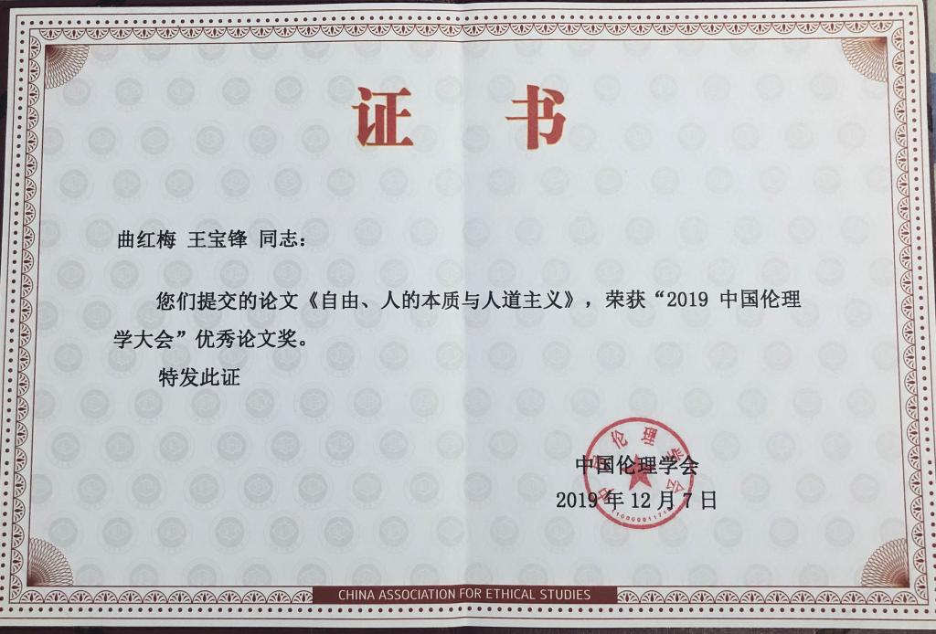 12月6日至8日,“2019中国伦理学大会”在长沙召开,八百多名伦理学研究者和道德文化工作者出席大会,本次大会的主题为“伦理学与人类命运共同体”。极速飞艇 曲红梅教授作为中国伦理学会常务理事出席了此次大会,受邀主持了“马克思主义与道德论坛”,并第三次作为对话嘉宾参与“中国伦理学青年学者与知名专家对话会”,就2019中外伦理热点同台下学者和观众进行了热烈讨论。曲红梅教授与极速飞艇 博士生王宝锋合作的论文“自由、人的本质与人道主义”获得“2019中国伦理学大会”优秀论文奖。
