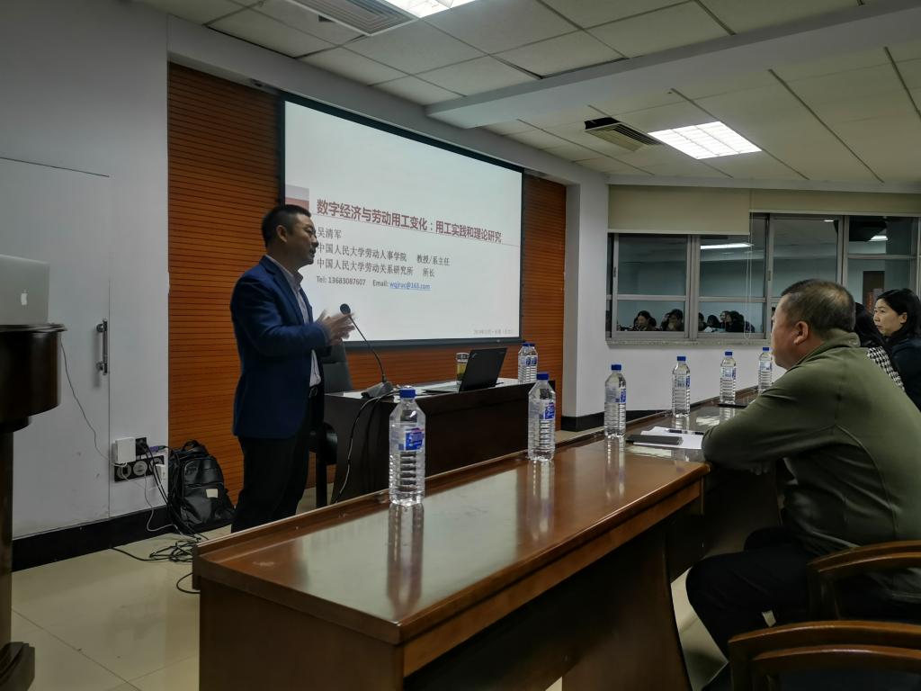 第60场学术名家讲座在东荣大厦904会议室举行。中国人民大学劳动关系研究所所长、中国劳动经济学会劳动关系分会副会长、中国人力资源开发研究会劳动关系分会学术委员会主任、中国人民大学劳动关系系主任吴清军教授,作了题为“数字经济与劳动用工变化:用工实践和理论研究”的学术报告。