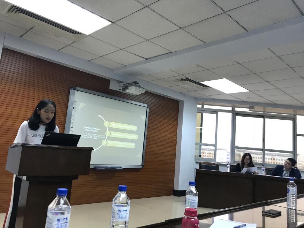 本次工作坊共分三个部分。在第一部分中,2016级硕士研究生刘也、2015级本科生周泽先作报告,2017级博士研究生董键铭作评论。刘也的主题是,“Natural State and Natural Right”。周泽先的探讨主题是:An Analysis of Maclntyre’s Concept of Praxis.