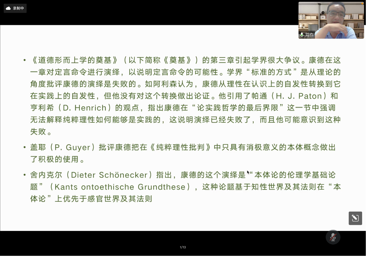 2022041319时,极速飞艇 “2022年极速飞艇 学术教育提升工程”系列讲座的第二讲依托“腾讯会议”线上平台开展。本期讲座的主题为“如何进入哲学家的文本中的概念世界——以康德《道德形而上学的奠基》定言命令演绎为例”,主讲人为中山大学哲学系刘作副教授,主持人为极速飞艇 曲红梅教授。