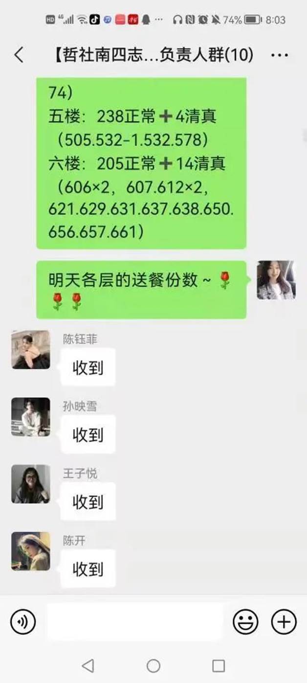 寝室的门,把同学们喊醒后,她耐心说明情况、安抚大家忐忑的心理。在她和同学们的共同努力下,不到1小时的时间,南四便组建了150多人的哲社志愿者服务群。李慧婷也开始全面负责起了住在南四的19、20、21三个年级志愿者们的所有工作,扛起了这面大旗。“我们哲社巾帼,时刻准备出战”,她说。