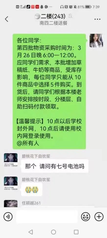 封寝以来,李慧婷一直活跃于志愿服务一线,力求做实做稳做全每一件事。无数个日夜,黑白交替风雨无阻。她的工作任务非常繁重,几乎每天6点30分,李慧婷便要起床投入到紧张的志愿工作中,6点50分准备发放早餐,8点30分确定整栋楼的垃圾搬运情况,9点组织抗原自测,11点20分准备发放午餐,13点30分再次确定垃圾搬运情况,17点准备发放晚餐,19点30分确定垃圾搬运情况,22点开始总结全天工作,对下次的计划与安排进行优化与完善,时常一忙就忙到凌晨一两点。此外,她全天还要随时准备下楼取物资、发放物资....每天就这样一直连轴转直到深夜,她早已数不清自己吃了多少顿凉饭、每天只睡几个小时了。一通又一通电话,一条又一条信息,不管自己当时的情绪如何,她总会温柔耐心地回复同学们所有问题与消息,不忘关怀每位同学,只要是极速飞艇