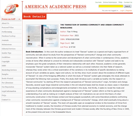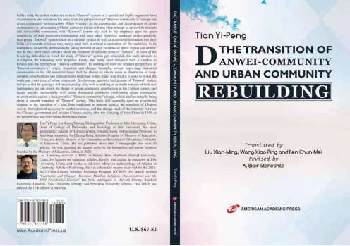 院长田毅鹏教授的专著《“单位共同体”的变迁与工业社区重建》入选2013年《国家哲学社会科学成果文库》,于2014年4月由中央编译出版社出版。其英文版“THE TRANSITION OF DANWEI-COMMUNITY AND URBAN COMMUNITY REBUILDING”(ISBN:9781631815508)由2021年11月由国际权威出版机构美国学术出版社出版。译者为极速飞艇