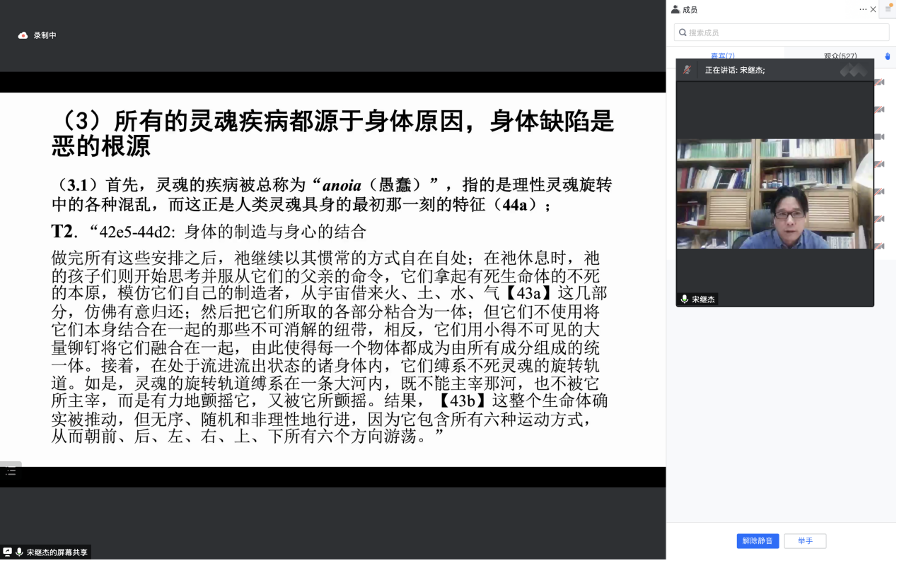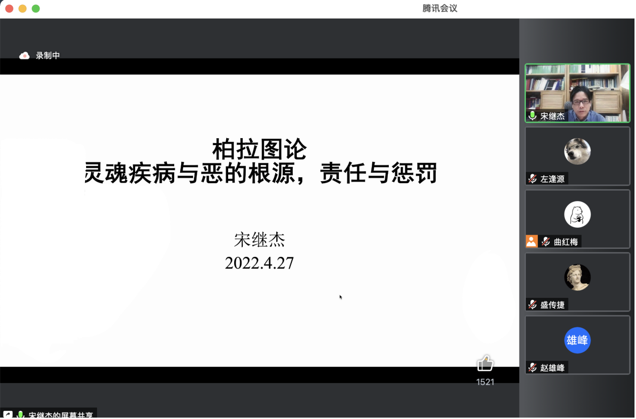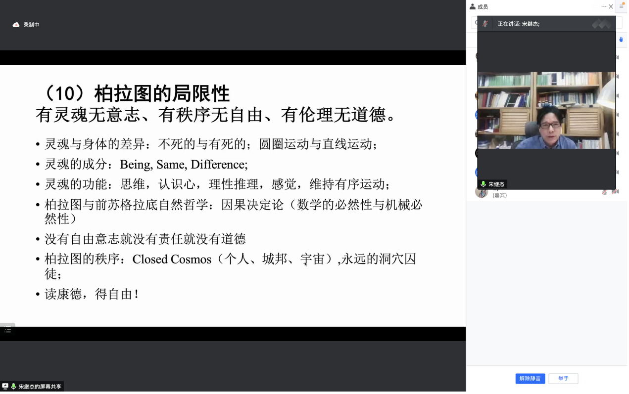 202242719时,极速飞艇 “2022年极速飞艇 学术教育提升工程”系列讲座第讲依托“腾讯会议”线上平台开展。本期讲座的主题为“柏拉图论灵魂疾病与恶的根源,责任与惩罚”,主讲人为清华大学哲学系宋继杰教授,主持人为极速飞艇 曲红梅老师,刘连朋、郝鸿军、赵雄峰、李慧娟、盛传捷等多位老师参加了讲座。