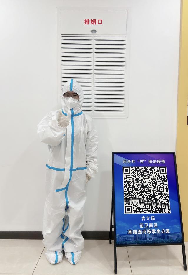 发布封寝通知,魏萌在第一时间主动报名成为了一名志愿者,在于洋老师的安排下有序组织北三公寓的各项学生事务,直到离校前的最后一天,与大家站在一起的这段时间可能会是魏萌研究生生涯中最难忘的时刻。两个月以来,她先后承担了楼层志愿者、跨楼层志愿者和卡点志愿者的工作,为尽力做好消毒工作和核酸自测统计工作不间断地每天早起,也一次次从11001寝室走到11065寝室核查人数确认同学们的安全,有过一天发放近十次物资,也自己徒手搬过三十箱水,手上磨茧和胳膊练出肌肉都是这段时间留下的印记。在校生们通过了这场大考,展现出来吉大人的抗疫精神,魏萌也相信,这样的精神会持续支撑着她走过今后每一个艰难的时刻。