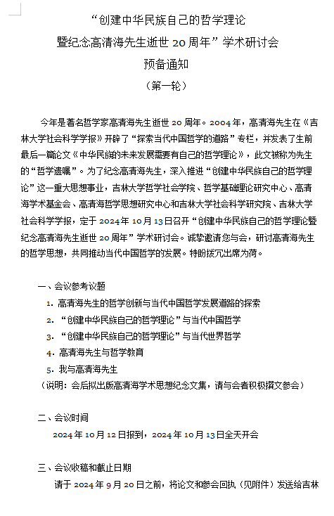 “纪念高清海先生逝世20周年学术研讨会”预备通知