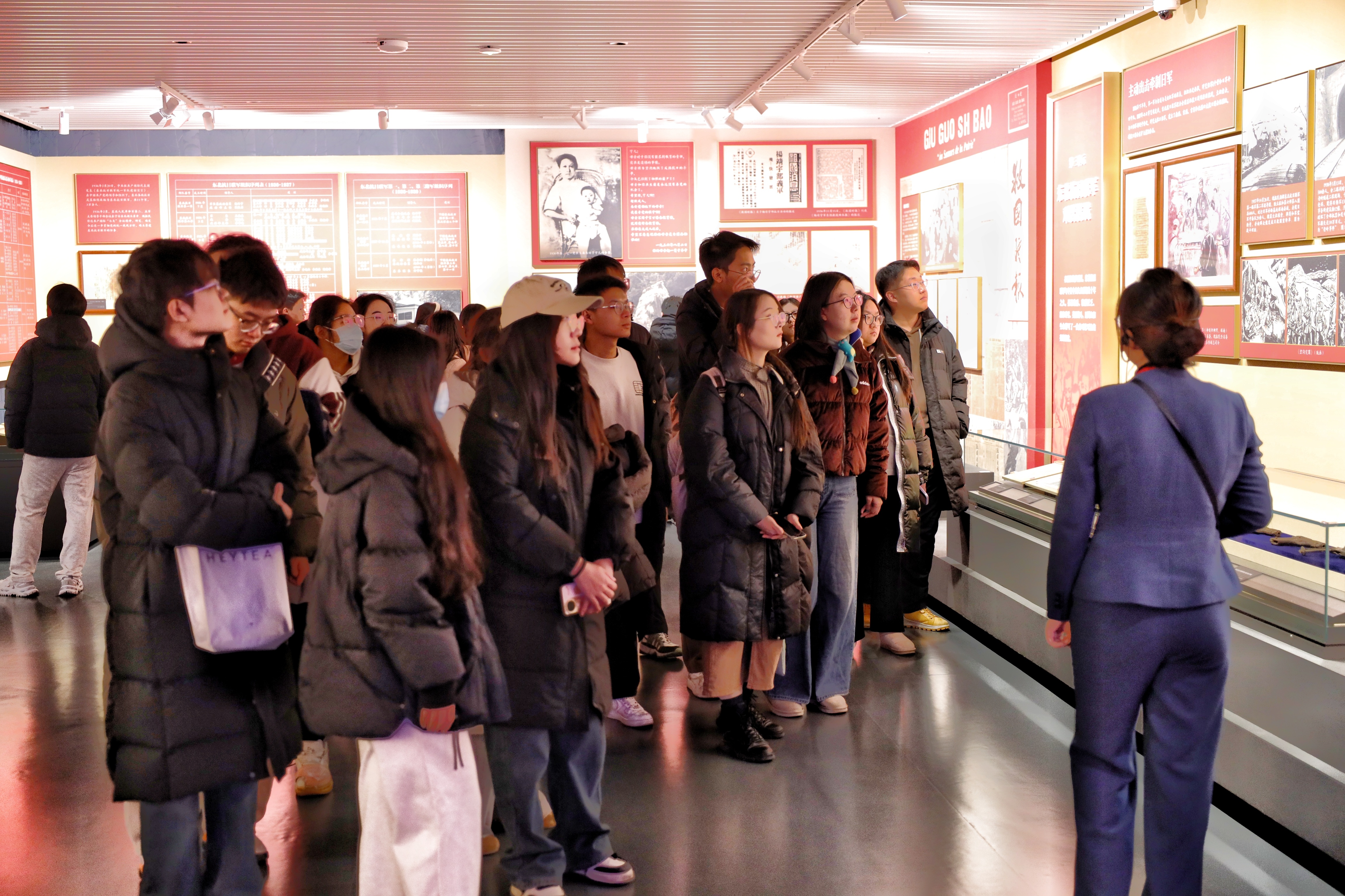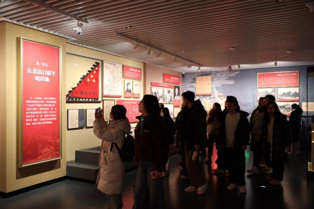 随着展览脉络延展,“十四年抗战”部分将现场氛围由沉郁逐渐引向激昂。在东北抗日联军相关文物与事迹陈列前,学生情绪深受触动。尤其当了解到杨靖宇将军在极端艰苦条件下孤身奋战、最终壮烈牺牲的事迹时,先辈们坚韧不拔、英勇抗争的民族气节深深震撼了每一位在场同学。众人仔细观摩每一件展品,认真聆听每一段解说,仿佛跨越时空,与那段壮阔历史紧密相连。活动尾声,全体研究生代表于“杨靖宇支队”战旗前合影,将此次深刻的学习体验凝定为永恒纪念。
