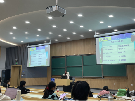 的宋芳菲教授聚焦翻译类题目来讲授。宋芳菲教授拥有海外语言学博士学历,是英国诺丁汉大学访问学者,曾参与高考、四六级考试、研究生入学考试等一系列重要考试的阅卷工作,也拥有丰富的一线教学经验。宋老师以雄厚的实力和丰富的经验吸引、感染了同学们,同学们踊跃参与,努力学习提升自己的英语能力和水平。