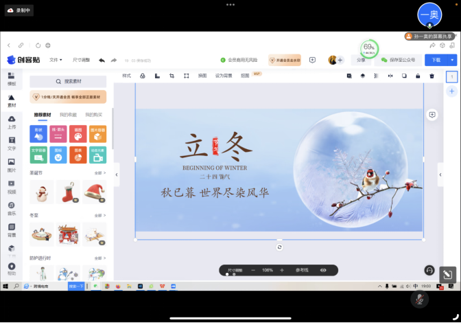 最后,孙一奥同学为与会者介绍了有关排版软件创客贴的有关操作和范例。孙同学向与会者展示并介绍了创客贴的页面,使与会者更好的融入、参与进新媒体人排版工作中来。孙同学以模板“立冬”为例,介绍了如何增添、减少元素,如何导入自己的元素,如何制作公众号推送的“首图”与“小图”,在他的讲解下与会者很好的掌握了创客贴的相关操作。