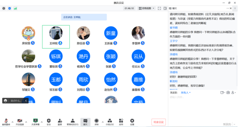 进入最终的提问环节,针对同学们提出的具体问题,2020级的师哥师姐们进行了详细解答,以便于同学们更加了解社会实践活动的相关事宜和流程。分享会在同学们愉快的氛围中顺利结束。
