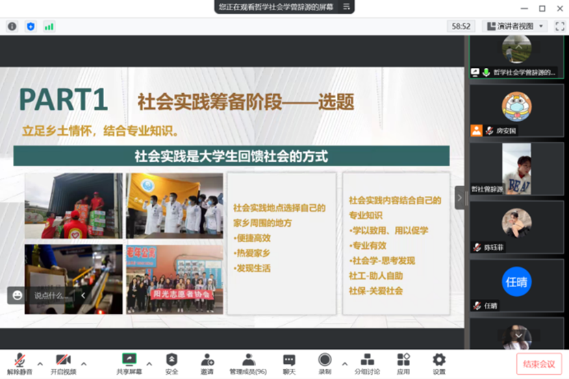 接下来,2020级社会学专业的曾辞源同学从筹备、落实、总结三个方面为大家带来了经验分享。他提到,社会实践是学生服务社会的有效途径,并推荐就近进行社会实践活动,结合自己的专业知识,以巩固自己的学习成果。曾辞源同学嘱咐大家注意社会实践的安全问题,同时强调了相关问卷设计与访谈提纲的重要性,做到精益求精,进而提升社会实践活动的专业性。