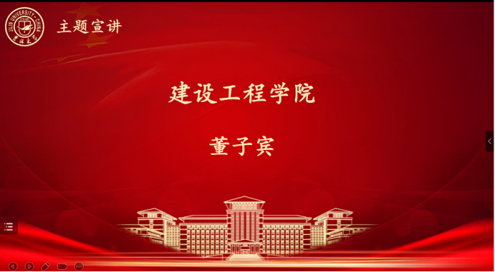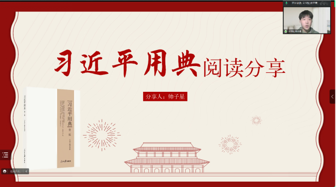 的帅子星同学通过“治政之要在于安民,安民之道在于查其疾苦”、“临大事而不乱,临利害之标不失故常”、“静而后能安,安而后能虑,虑而后能得”、“见贤思齐焉,见不贤而内自省也”这四句典故,从治世、遇事、待事、求是的角度提出,作为新时代青年大学生,要坚定理想信念,严于律己、勤于钻研、善于学习。然后,他向大家分享了“门板银元”和“割稻相送”这两个讲述军民鱼水情的感人故事,并结合实际讨论过去的十年中党领导下的中国人民在脱贫攻坚、保障人民民主等方面取得的诸多成就。