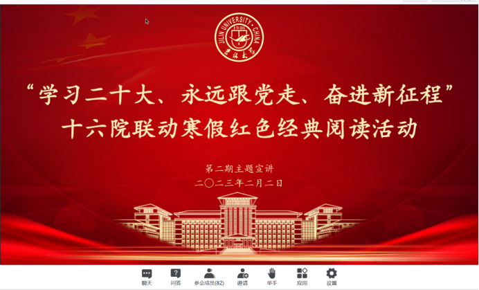 阅读经典,有助于我们客观清醒地学习中华优秀传统文化和社会主义先进文化,细致深刻地感悟党领导人民过去五年的工作和新时代十年的伟大变革,做到明理增信、崇德力行。在五位主讲同学和参会同学们的热情交流中,第二期寒假红色经典阅读活动圆满结束!