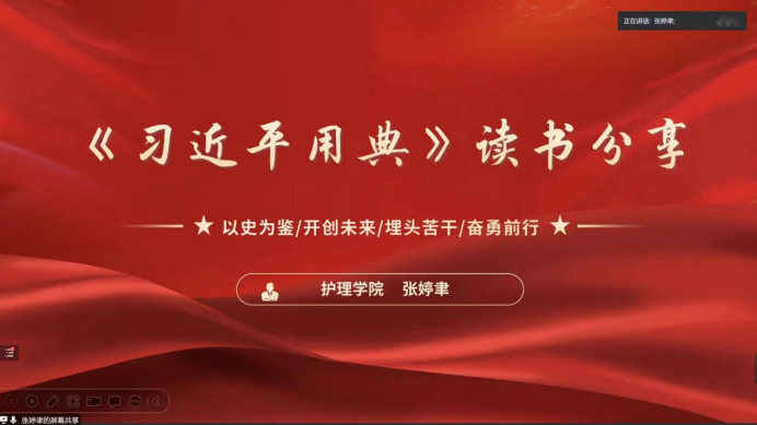 的张婷聿同学分享了《习近平用典》一书中与其最有渊源的《信念篇》。高三时的她偶然读到“志之所趋,无远勿届,穷山距海,不能限也。志之所向,无坚不入,锐兵精甲,不能御也”,这句话发张婷聿同学的思考。在深入阅读后,张婷聿同学分享了这句话对自己的启发与感悟:国家要有目标、人民要有目标、青年更要有目标。作为新时代的大学生,更应珍惜自己宝贵的青春年华,坚持理想,脚踏实地,将自己的人生深深扎根在祖国大地上。