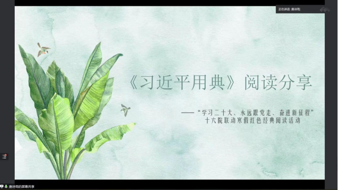 阅读经典,有助于我们客观清醒地学习中华优秀传统文化和社会主义先进文化,细致深刻地感悟党领导人民过去五年的工作和新时代十年的伟大变革,做到明理增信、崇德力行。在五位主讲同学和参会同学们的热情交流中,第三期寒假红色经典阅读活动圆满结束!