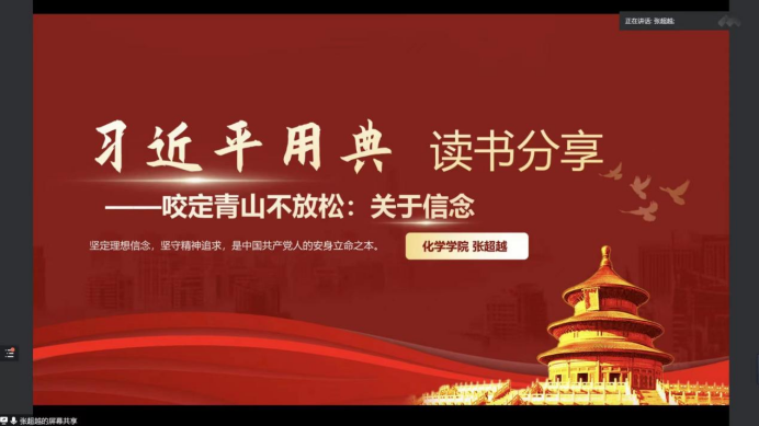 的张超越同学向与会同学们分享了自己对《习近平用典·信念篇》的阅读感悟。“志之所趋,无远勿届,穷山距海,不能限也。志之所向,无坚不入,锐兵精甲,不能御也”,这是人为什么要有理想信念的最好回复;“位卑未敢忘忧国”,这是人应树立起怎样的理想信念的最佳解答;“咬定青山不放松,立根原在破岩中。千磨万击还坚劲,任尔东西南北风”,这是人应怎样坚持理想信念的最优方案。