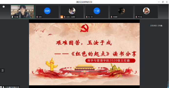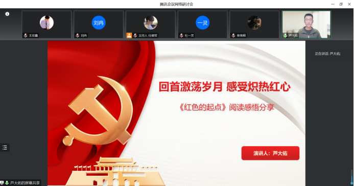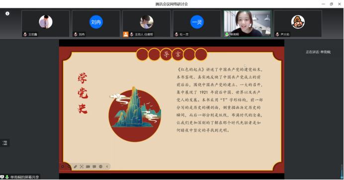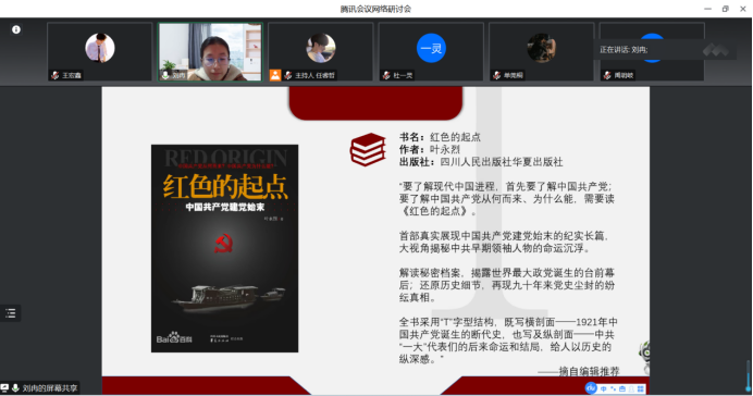 的刘冉同学通过回顾书中的主要内容和背后的时代故事向同学们分享了自己的心得体会。她认为,作为青年大学生,我们要铭记党的历史,明确自己的奋斗目标,用党在百年奋斗中形成的伟大精神滋养自己、激励自己,以昂扬的精神状态做好本职工作,努力学习,要争取能够努力创造无愧于党、无愧于人民、无愧于时代的业绩,为中华民族伟大复兴做出当代青年的贡献。