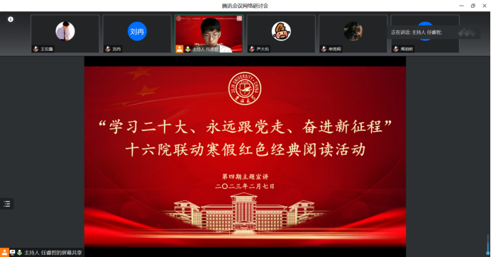 阅读经典,有助于我们客观清醒地学习中华优秀传统文化和社会主义先进文化,细致深刻地感悟党领导人民过去五年的工作和新时代十年的伟大变革,做到明理增信、崇德力行。在六位主讲同学和参会同学们的热情交流中,第四期寒假红色经典阅读活动圆满结束。