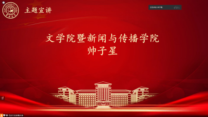 的帅子星同学和大家分享了自己阅读《习近平与大学生朋友》这本书的感悟。“桃李不言、下自成蹊”,习近平总书记和青年学子之间的交集和沟通,提升了青年学子自身的涵养与担当,引导他们走出了一条条通向社会主义现代化强国的道路。时至今日,伴随着《习近平与大学生朋友》这本书一起走来的,是血脉的传承,也是学习的动力。