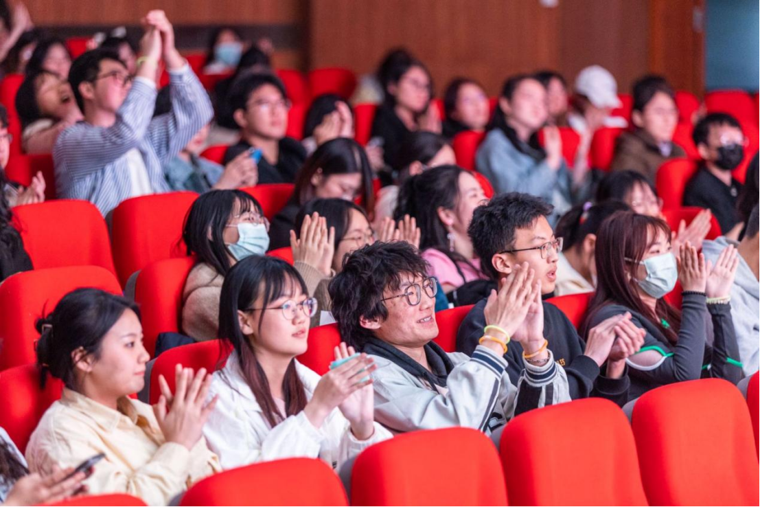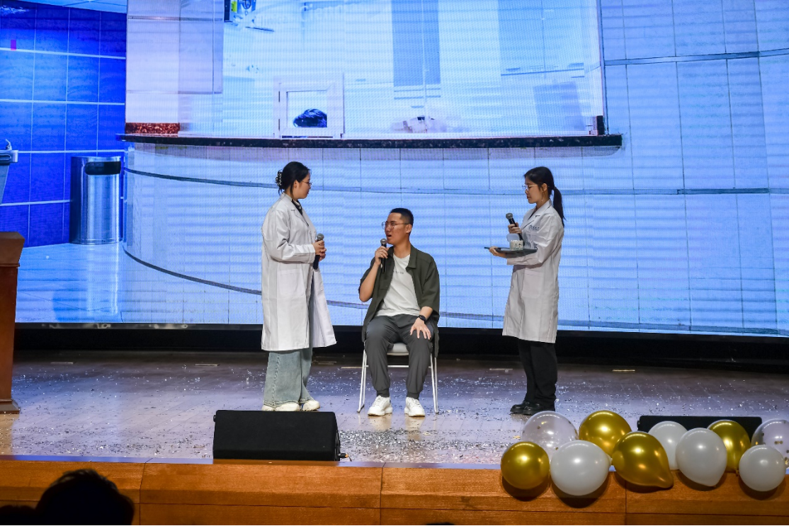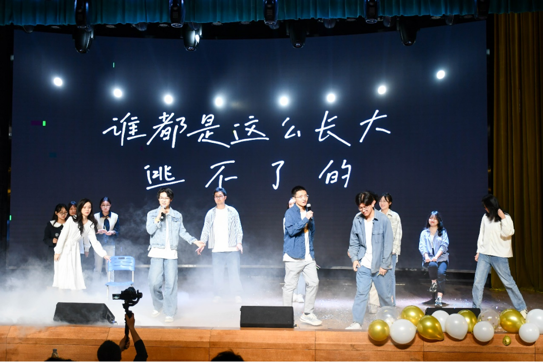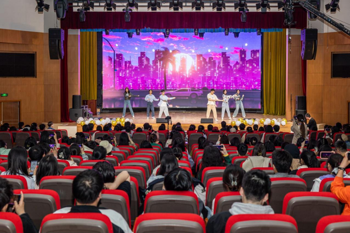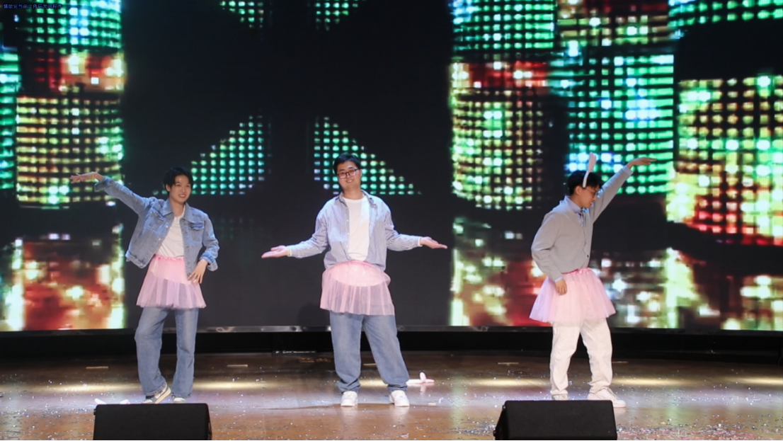 这也许是人生中距离K-POP最近的一次?辅导员宋绍伟老师和来自2020级的王梓铭、曾辞源两位同学共同跳起了“三哈”舞,可爱的舞姿和律动的音乐再次将全场的氛围烘托到高潮。台下的观众纷纷举起手机,留下这宝贵的精彩瞬间,笑容在台下每位观众的脸上停留。