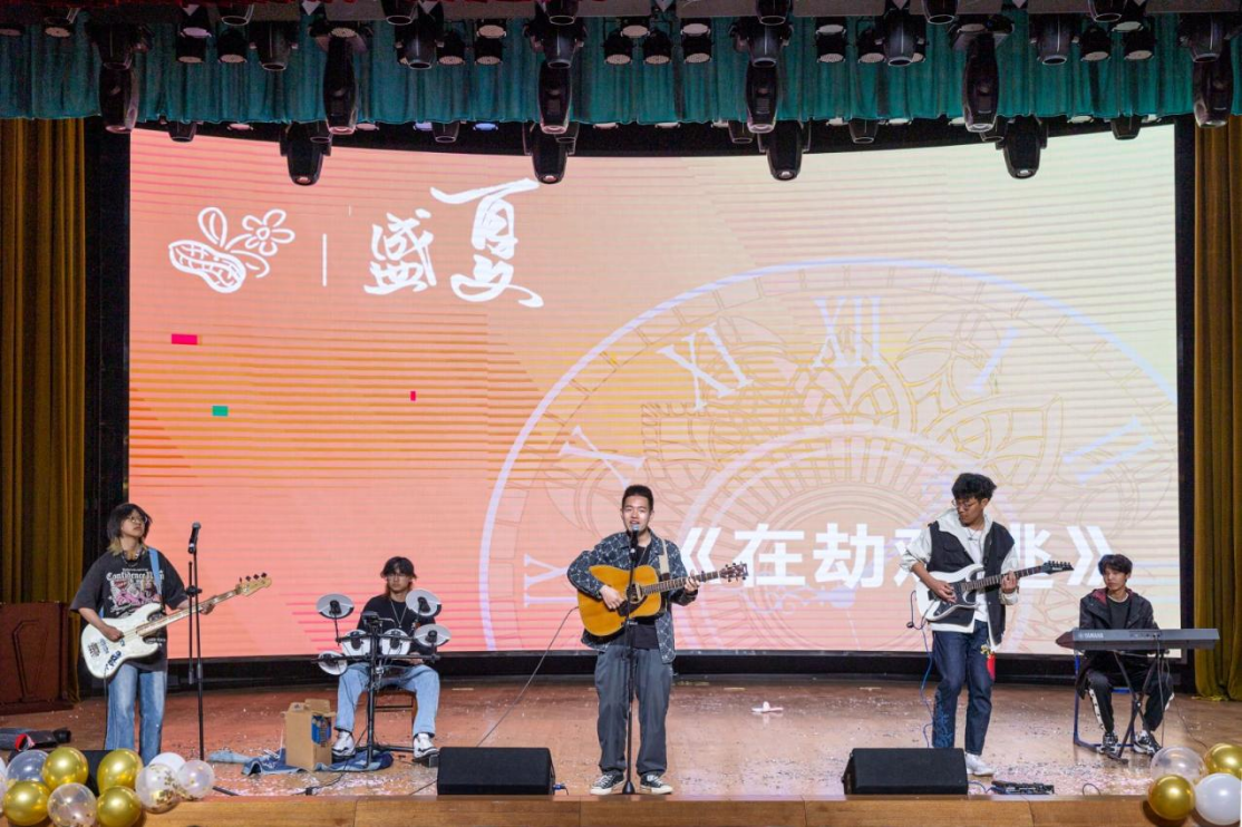 来自曲曲吉他社的同学们带来了歌曲《在劫难逃》,浪漫的旋律渲染出青春的氛围,同学们陶醉在乐队带来的充满韵律的音乐中,感受着美妙旋律带来的快乐,更在接下来的“安可”环节中体验着沉浸式的Livehouse享受。